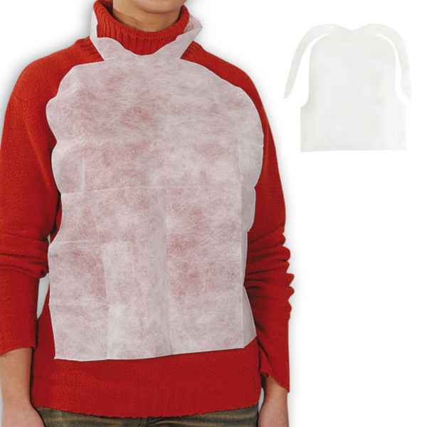 Bavaglino monouso in tnt con lacci. Formato per adulti cm 42x51 grammatura del tessuto 40gr. Questo bavaglio monouso è perfetto per la ristorazione e per tutti quelli che per esempio cucinando pesce vogliono dare un servizio ai loro clienti.
