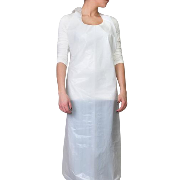 Grembiule monouso in polietilene bianco con lacci per chiusura posteriore. Grembiule monouso lungo con pettorina ideale per caseifici, macellerie, pescherie, gastronomie. Grembiule pratico, non assorbe i liquidi e può essere ripulito con spugna all'occorrenza.