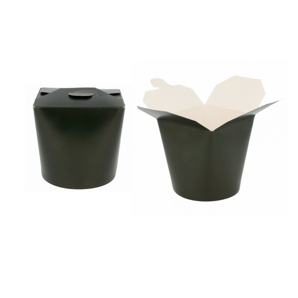 Contenitore da asporto in cartone alimentare con interno in carta bianca antigrasso e esterno in elegante cartoncino nero. Ideale per pasta, noodles, insalate, cibi caldi, bocconcini di pollo e molto altro. Pratico, resistente e versatile: perfetto per il tuo servizio take away o delivery.