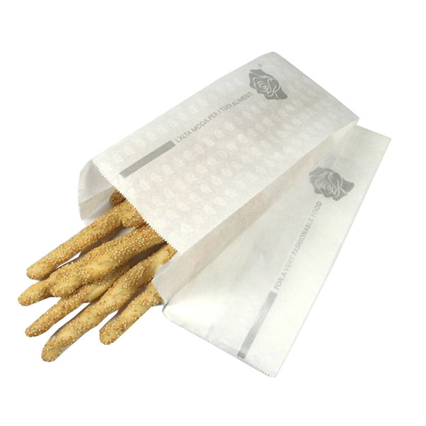 Sacchetti di carta antigrasso bianco idoneo al contatto diretto con alimenti. grammatura carta 40g/mq. Sacchetto studiato per fornire resistenza alle sostanze grasse, utilizzati principalmente in pasticceria, panetteria, rosticceria, friggitoria, bar.