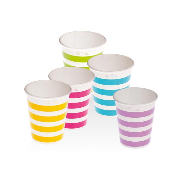 Bicchieri di carta. Bicchieri perfetti per party, feste e compleanni, simpatico per decorare e rallegrare la tavola. Bicchieri abbinabili alla linea party disponibile nel nostro e.commerce. La base del bicchiere è bianca con righe stampate, scegli il tuo colore preferito.