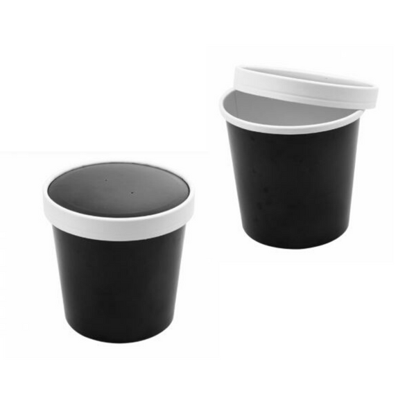 Contenitori per asporto cibi caldi, primi piatti o zuppe, idoneo anche per alimenti freddi. Contenitore per consegne a domicilio in cartone nero interno bianco. Il coperchio è cartone a doppia parete.