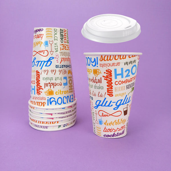 Bicchiere di carta per bevande fredde. Bicchiere asporto in cartoncino con stampa parole nella parte esterna e interno completamente bianco. Il coperchio è bianco e in materiale PS. Il coperchio per bicchiere da 360 ml presente è biodegradabile nel materiale CPLA.