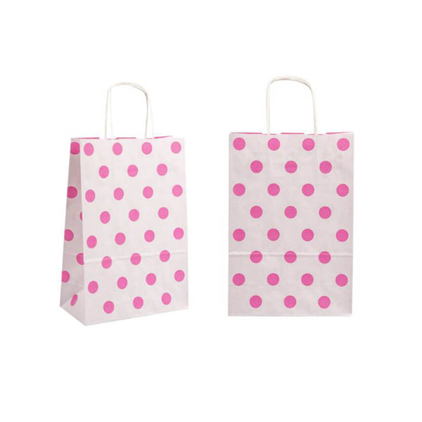 Shopper di carta con manici. Shopper esterno in carta bianca con stampa pois fucsia. Manici in carta cordino colore bianco. Shopper perfette per negozi e anche per completare velocemente confezioni regalo.