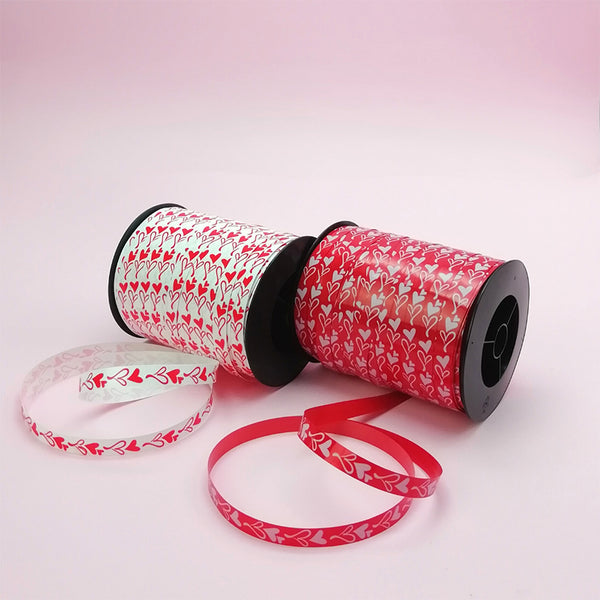 Nastri decorativi per pacchi e confezioni regalo. Nastro stampato con cuoricini disponibile in due varianti colore, con nastro base rossa e nastro base bianca. Il nastro rosso ha cuori stampati nel colore bianco. Il nastro bianco ha cuori stampati in rosso. Altezza del nastro cm 1, lunghezza 250 metri.