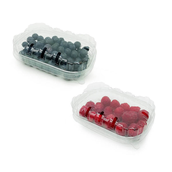 Vaschette per mirtilli in pet trasparente per alimenti, base e coperchio sono separate e sono vendute separatamente su questa pagina. Piccola vaschetta per frutti di bosco, more, mirtilli, lamponi con coperchio staccato. Disponibile con base pluriball. Può contenere 125 grammi di prodotto.