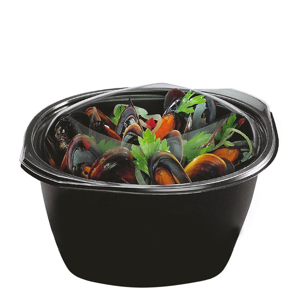 Vaschette per microonde base nera con coperchio trasparente antiappannamento. Questa ciotola è perfetta per riscaldare alimenti anche nel forno a microonde. Materiale resistente, questa ciotola si presta tantissimo anche come piatto da portata, non solo come contenitore da asporto. Base della ciotola colore nero in PP e coperchio trasparente cristal PP.