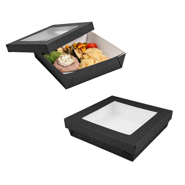 Scatola con Finestra per Alimenti in carta antigrasso con coperchio. Contenitore in cartone nero e interno bianco antigrasso con finestra trasparente, perfetta per visualizzare il contenuto senza dover aprire la scatola. Questo versatile contenitore è ideale per pranzi da asporto e può contenere sia cibi grassi che secchi, dolci o salati. Ideale per pasticcerie, suhi, antipasti, questa scatola con finestra aggiungerà un tocco professionale ai tuoi piatti. Disponibile in due misure: