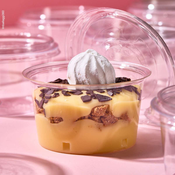 Coppetta monoporzione trasparente capacità 180 cc. Aggiungi un tocco di eleganza alla tua piccola pasticceria o agli aperitivi con la nostra coppetta monoporzione trasparente. Il modello Coppetta Cream Kristal è caratterizzato dalla sua brillantezza e trasparenza ed è ideale per piccola pasticceria, stuzzichini e aperitivi. Puoi scegliere di acquistare solo la base, o base+coperchio. Coppetta e coperchio sono venduti separatamente su questa scheda:
