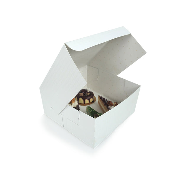 Scatola per alimenti in cartone con coperchio unito. Questa scatola modello cubo è perfetta per contenere torte ma può essere utilizzata per contenere prodotti come pasticcini o anche prodotti salati. Le misure indicano in ordine misura della base, larghezza e altezza della scatola.