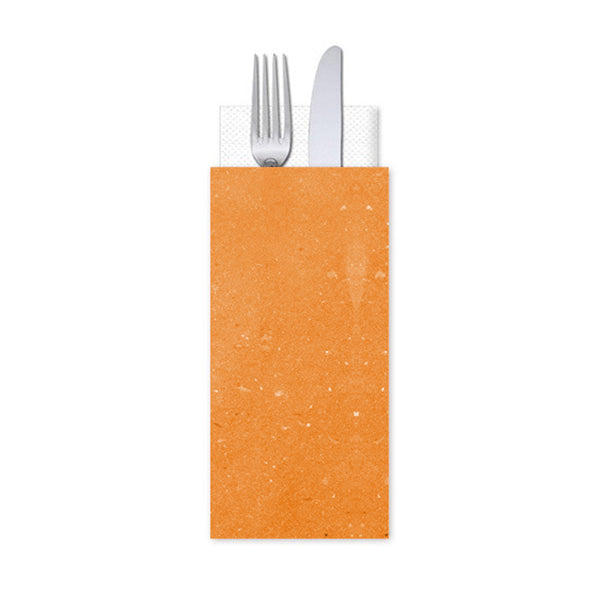 Portaposate con tovaglioli in carta, perfetto per un pranzo veloce e pratico. Realizzato in carta paglia colorata arancione, presenta un'apertura superiore per posizionare comodamente le tue posate. Aggiungi un tocco di colore e funzionalità al tuo servizio da tavola.