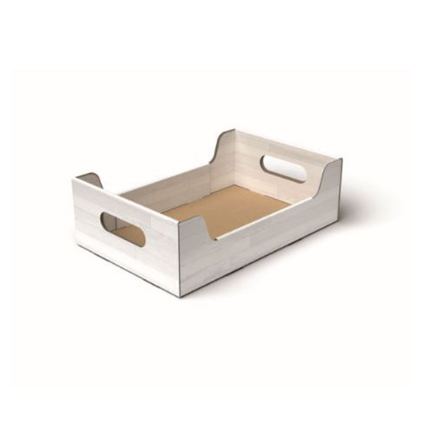 Cassetta in cartone per confezioni con manici laterali pratica e facile da montare. Cassette resistenti in cartone con stampa effetto legno ideali per confezionare cesti regalo o per frutta. Disponibile in tre misure con differenti finiture: