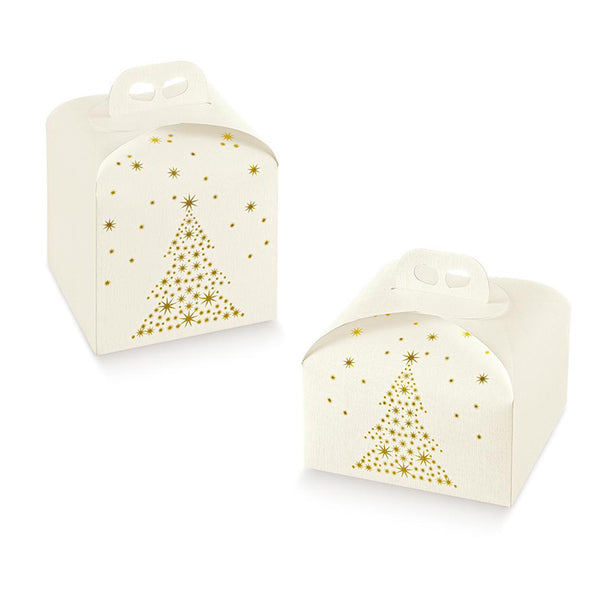 Scatola panettone in cartone bianco con stampa alberi stelle in oro lucido. Aggiungi un tocco di eleganza alla tua festa con la nostra Scatola Panettone in cartone bianco, impreziosita dalla stampa dorata di un albero natalizio. La pratica maniglia facilita il trasporto, rendendo questa scatola non solo bella ma anche funzionale.