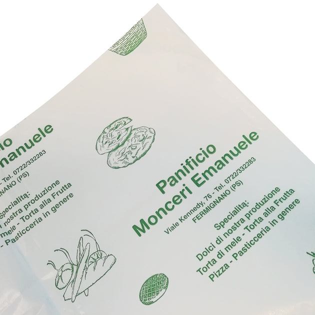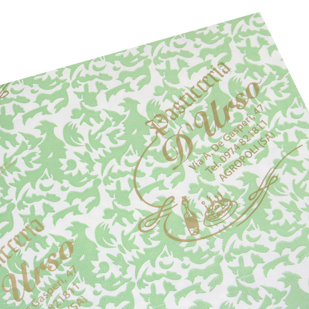 Carta pasticceria pelleaglio in carta di pura cellulosa per alimenti, ideale per il confezionamento di prodotti da pasticceria, bar e forno. La carta pelleaglio è il classico involto utilizzato per vassoi d'asporto e può essere personalizzata con il tuo logo ripetuto nella carta. Utilizziamo colori con inchiostri a base d'acqua idonei al contatto alimentare.