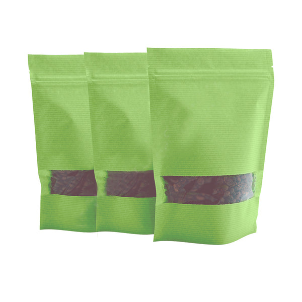 Sacchetti con zip per alimenti in carta verde opaco. Busta termosaldabile in carta millerighe disponibile senza finestra e con finestra.