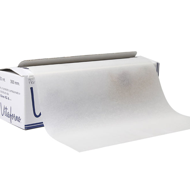 Rotolo di carta forno per alimenti confezionato in un pratico box in cartone, dotato di seghetto per facilitare lo strappo.