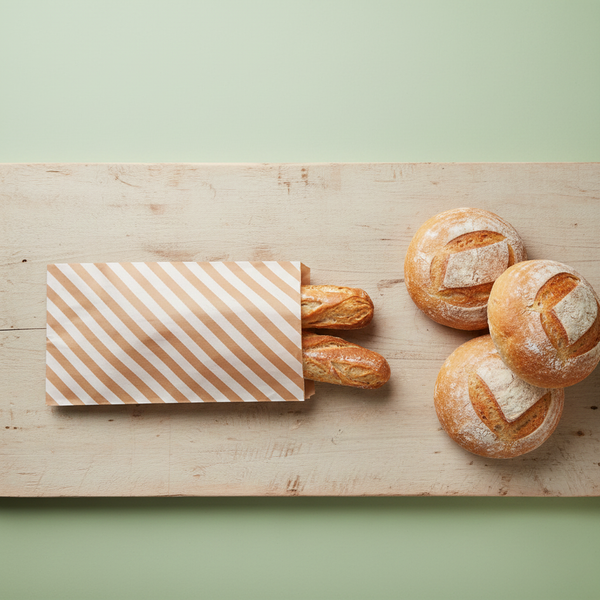 Sacchetti per alimenti carta kraft 60g/m2 con stampa righe bianche. Idonei al contatto diretto con alimenti. Non adatto a contenere alimenti unti.