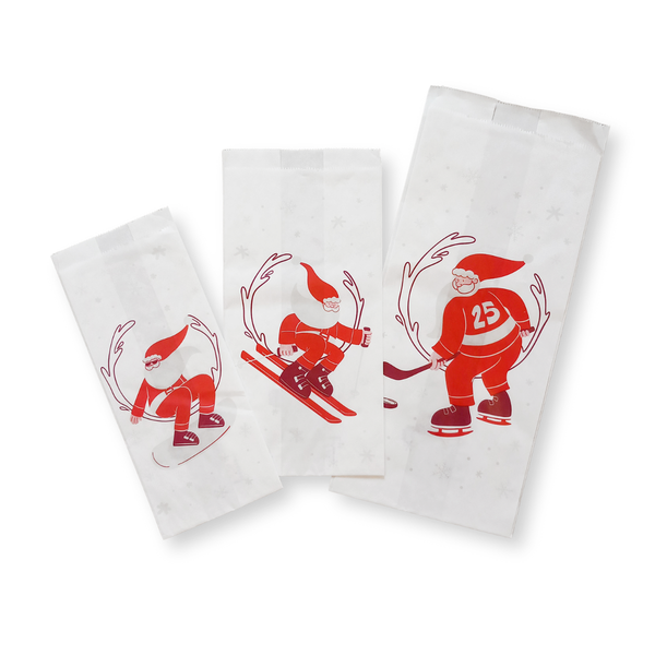 Sacchetti in carta per alimenti con stampa natalizia. Sacchetto classico e sempre usato da alimentari, pasticcerie, gastronomie per confezionare, frutta, salumi, pane, formaggi. Sacchetto stampato fronte e retro con due grafiche differenti.