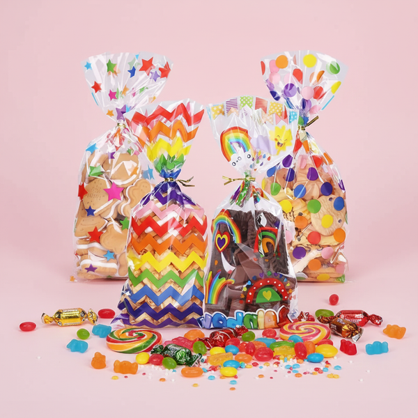 Sacchetti per caramelle disponibili con quattro stampe miste e legaccio oro per chiudere il sacchetto. Sacchetti regalo trasparenti decorati con vivaci motivi arcobaleno! Perfetti per confezionare caramelle, biscotti e piccoli regali, sono l’ideale per compleanni, matrimoni, Pasqua e altre occasioni speciali. Un set da 100 sacchetti con stampe coloratissime.