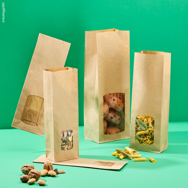 Sacchetti termosaldabili in carta avana con finestra frontale sono la soluzione ideale per preservare l'integrità dei tuoi alimenti. Grazie al film interno, questi sacchetti possono essere termosaldati per garantire una chiusura ermetica, mantenendo il contenuto fresco e fragrante. Ideali per alimenti sono utilizzati da forni, pasticcerie, aziende agricole e pastifici, sono perfetti per contenere biscotti, pasta secca, frutta secca, tisane, caramelle, grissini e molto altro. Grammatura di carta di 80 g/m².