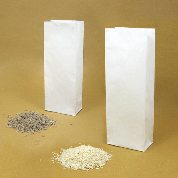Sacchettidi carta termosaldabili per alimenti. Sacchetti in carta bianca lucida con fondo quadro. Disponibile in due formati sul nostro ecommerce. Viene utilizzato per contenere farina, tisane, pasta, caffè, riso, biscotti. Questo prodotto è idoneo al contatto diretto con alimenti. Le misure indicano in ordine: base, soffietto e altezza del sacchetto.