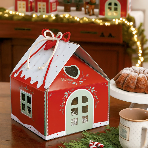 Scatola panettone casetta rossa in cartone colorato con manico in cordino di cotone (1 cordino per la casetta Mini, 2 cordini per le casette più grandi). Scatola regalo con finestre fustellate aperte ideali per confezionare panettoni, oggettistica, prodotti enogastronomici. Scatola speciale nel suo genere, comoda per il trasporto grazie al resistente laccio in cotone avana e finestrelle intagliate. Disponibili tre modelli per panettone alto, basso e mini. Le misure indicano in ordine base, larghezza e altezza della scatola. Le scatole nel punto più alto del tetto misurano 31 cm.