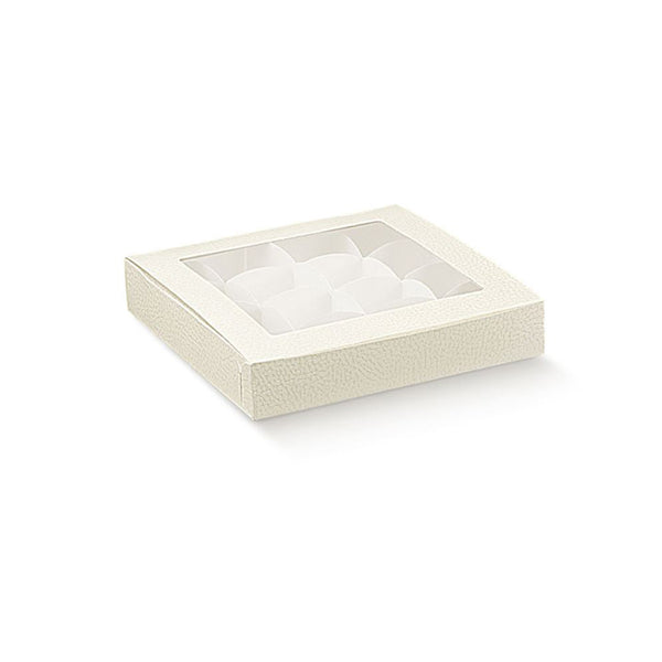 Scatola porta cioccolatini in cartone bianco per alimenti con finestra in pvc trasparente sul coperchio. All'interno della confezione troverai degli inserti in cartoncino bianco appositamente progettati per contenere 16 cioccolatini, con scomparti di dimensioni 4x4 cm ciascuno. Perfetta per pasticcerie, o come scatola regalo o per presentazioni speciali, questa scatola porta cioccolatini aggiungerà un tocco di eleganza al tuo confezionamento.