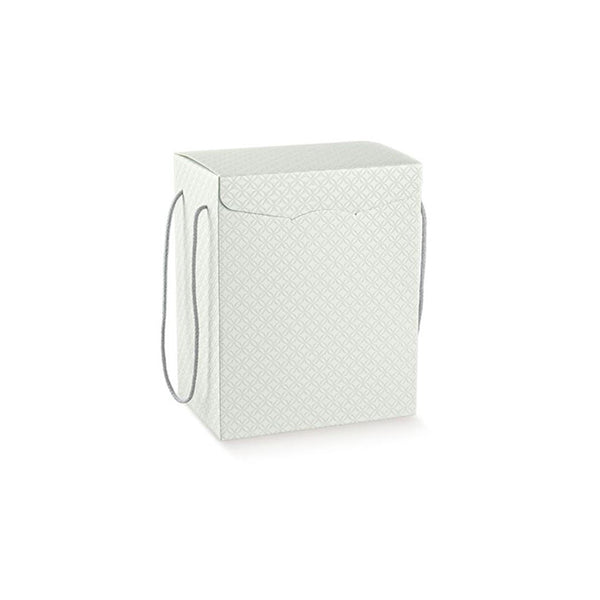 Scatole in cartone con manici cordino. Scatole perfette per confezione regalo, scatola con manico in cartone grigio chiaro finitura matelassè grigio. Il modello misura cm 28+20 h35 (finitura matelassè grigio) è una scatola per confezione e scatola porta bottiglie.