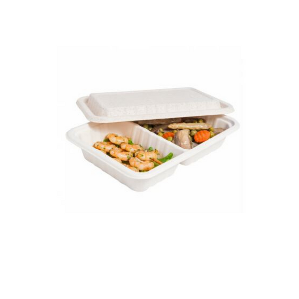 Vaschetta biodegradabile con scomparti e coperchio separato, ideale per l’asporto di alimenti. Realizzata in bagassa, un materiale naturale derivato dalla lavorazione della canna da zucchero, è compostabile, resistente ai grassi e adatta al contatto con gli alimenti.