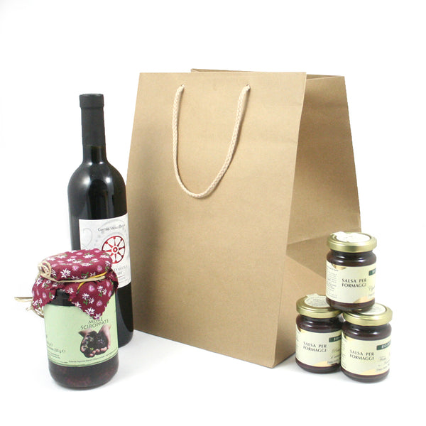 Shopper fondo largo per confezioni. Shopper in carta 180g/m2 di colore avana con fondo largo e manico cordino in cotone. Questa shopper in carta resistente è ideale per confezionare prelibatezze oppure oggetti o scatole, che posson essere comodamente contenute nella shopper grazie all'ampio soffietto di 26 cm. Ideale anche per confezionare panettoni o confezioni regalo in genere.