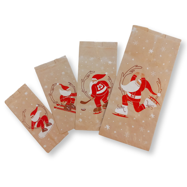 Sacchetti di carta kraft modello classico pane con stampa natalizia con babbo natale. Sacchetto modello classico sempre usato da alimentari, pasticcerie, gastronomie per confezionare, frutta, salumi, pane, formaggi, tramezzini. Sacchetto stampato fronte e retro con due grafiche differenti come da foto.