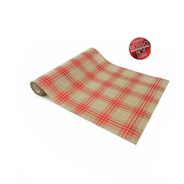 Runer natalizi a rotolo. Modello runner a rotolo che può essere tagliato nella lunghezza desiderata. Tovaglia monouso, altezza cm 28; lunghezza del rotolo 3 metri. La Stampa è scozzese rosso lucido cangiante.