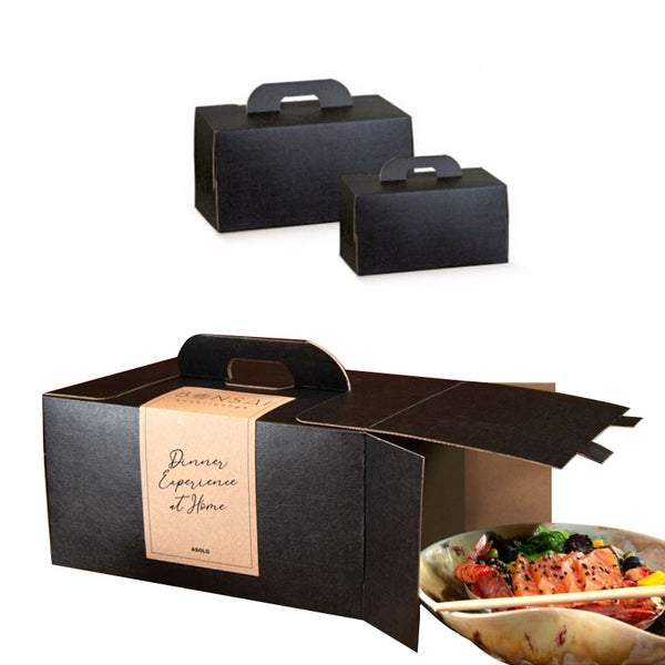 Scatola per asporto nera in cartone resistente con pratica maniglia. Valigetta in cartoncino accoppiato, con maniglia ripiegabile e apertura laterale. Questa linea di scatole in cartone per asporto è Made in Italy, cartone riciclabile, sono richiudibili, facili da montare, comode per il trasporto grazie alla maniglia superiore, personalizzabile su richiesta.