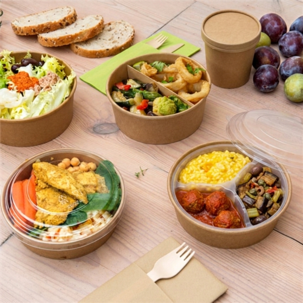 Contenitore pokè da 750 e 1.000 ml da asporto in cartone con accessori a scomparti è la soluzione perfetta per confezionare, suddividere e trasportare alimenti come insalate, frutta tagliata, piatti pronti, pasta e molto altro. Dotato di coperchio trasparente e in cartoncino e separatori inseribili all'interno a vostra scelta: separatore a due scomparti in caroncino o separatori a uno, due, tre scomparti trasparenti. Il rivestimento della ciotola interno in polietilene garantisce la protezione degli alimenti e previene eventuali perdite di liquidi. Questa ciotola da asporto è ideale per bar, ristoranti, fast food, catering, feste. Ciotola, coperchi e separatori sono venduti separatamente, componi la tua ciotola: