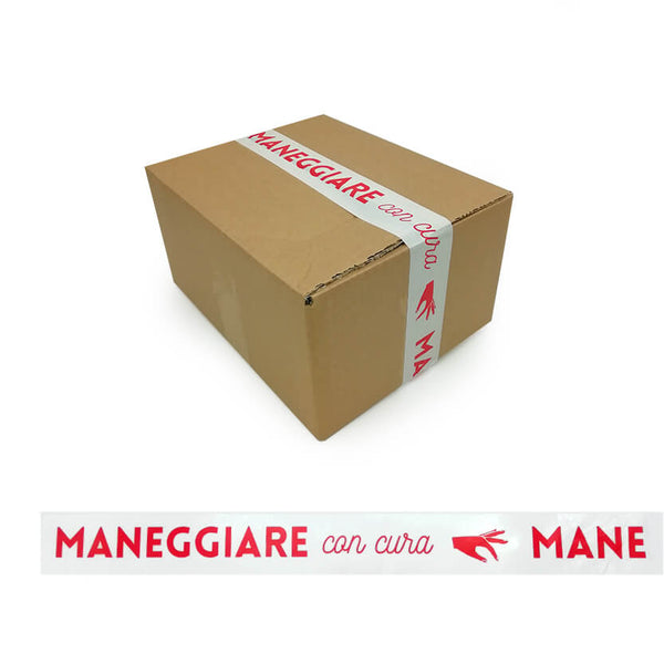 Nastro per spedizioni in PLP con stampa 1 colore rosso "maneggiare con cura". Cura e Sicurezza: Scegli il Nastro Adesivo Personalizzato per le tue spedizioni! Il nostro Nastro per spedizioni in PLP, con stampa a un colore rosso "Maneggiare con Cura", è un gentile invito ai corrieri affinché trattino i tuoi pacchi con la massima attenzione. Garantisci che i tuoi preziosi articoli raggiungano destinazione in perfette condizioni.