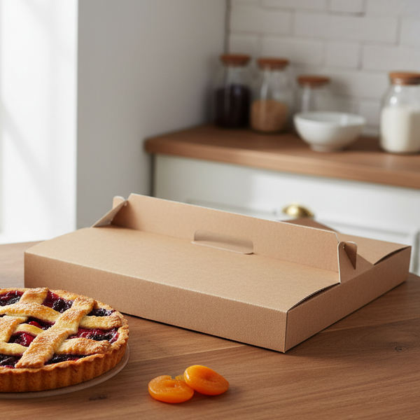 Scatola avana in carta per crostata, elegante e pratica grazie alla comoda maniglia che rende l’asporto semplice e sicuro. Realizzata in cartone naturale riciclabile e biodegradabile, combina resistenza all’umidità con leggerezza e capacità termica, mantenendo le crostate protette e invitanti fino al momento del consumo. Un packaging studiato per valorizzare i tuoi dolci, prodotto in carta 100% vergine, certificata FSC, che unisce qualità professionale e rispetto per l’ambiente. Fabbricata in Unione Europea, è la scelta ideale per pasticcerie, forni e attività di catering che vogliono unire praticità e presentazione impeccabile.
