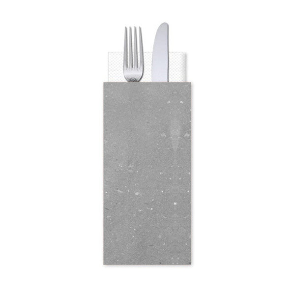 Portaposate con tovaglioli in carta, perfetto per un pranzo veloce e pratico. Realizzato in carta paglia colorata grigio, presenta un'apertura superiore per posizionare comodamente le tue posate. Aggiungi un tocco di colore e funzionalità al tuo servizio da tavola.
