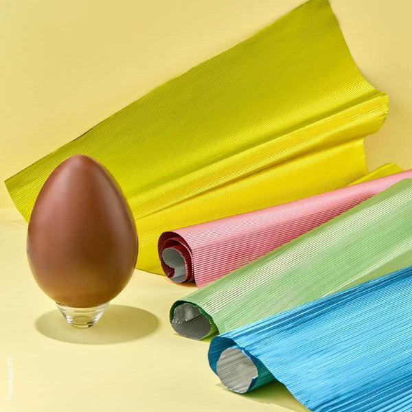 Fogli carta alluminio colorata per alimenti. Fogli perfetti per confezionare uova di Pasqua, disponibili in quattro varianti colore nel formato 50x70 in confezioni da 1 kg (circa 44 fogli). Fogli alluminio pieghettato perfetto per confezioni adatto al contatto diretto con alimenti.