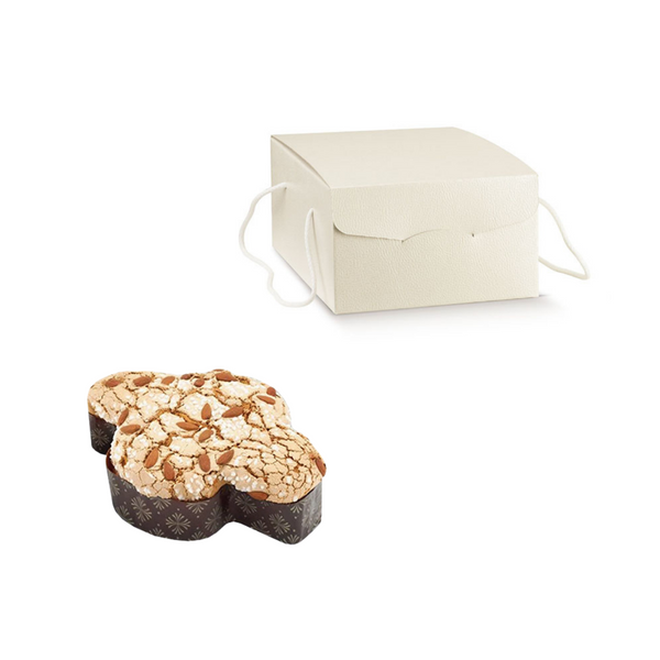 Scatola porta colomba in cartone per alimenti colore bianco. Automontante sarà pronta con un solo scatto. Inclusi nella confezione due manici in cotone per ogni scatola.