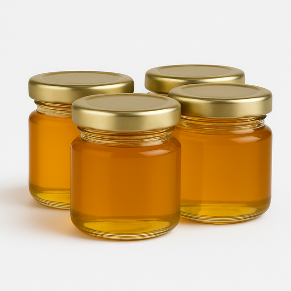 Barattolo in vetro trasparente per miele o marmellate può contenere 53 ml di prodotto. Barattolo con tappo a vite disponibile sia bianco che oro, ideale per contenere piccole porzioni di miele, marmellate, pesti e altri alimenti che si conservano in vetro. Barattolini perfetti per campionature o piccoli assaggi.