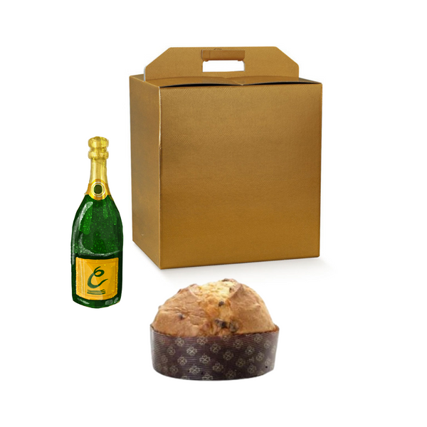 Scatola panettone e bottiglia in cartone oro con pratica maniglia. Questa scatola regalo può contenere panettone e bottiglia.