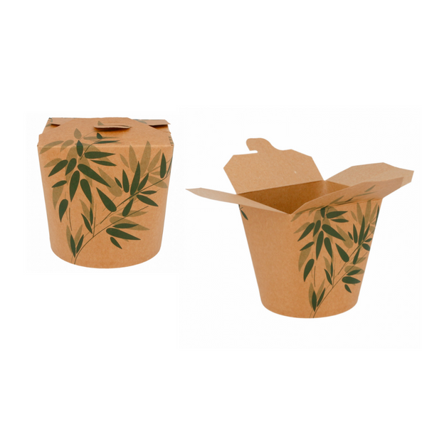 Contenitore da asporto per consegne a domicilio, perfetto per contenere pasta o noodles. Contenitore in carta antigrasso avana con decoro foglie verdi nella parte esterna. Contenitore in cartoncino per noodles, pasta calda, disponibile in due formati. Contenitori take away in carta antigrasso per cibo caldo. Contenitori per pasta e alimenti da asporto monouso