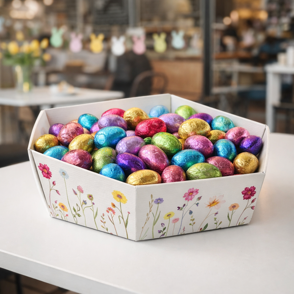 Cesto in cartone stampato in cartone bianco a forma esagonale, stampa fiori primaverile. Gusto delicato e unico, questo cesto in cartone è perfetto per completare confezioni gastronomiche con stile.