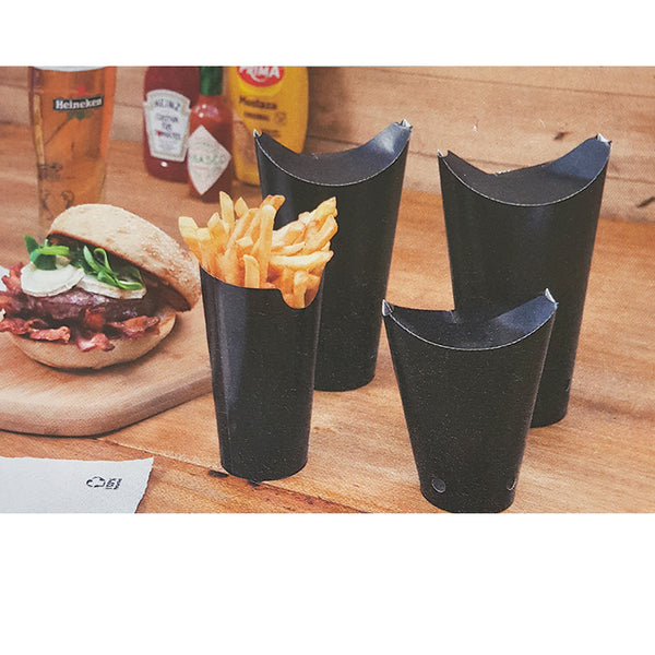 Contenitore in carta asporto fritto. Bicchierinoin cartone con un elegante esterno nero e un interno in carta antigrasso bianca, che garantisce che il cibo rimanga fresco. Questi contenitori con chiusura superiore con doppia aletta sono perfetti per contenere patatine, fritti e altri cibi che possono rilasciare unto. Grazie al loro design, i bicchierini possono essere posizionati in piedi, rendendo facile e veloce la preparazione dei tuoi piatti da asporto.