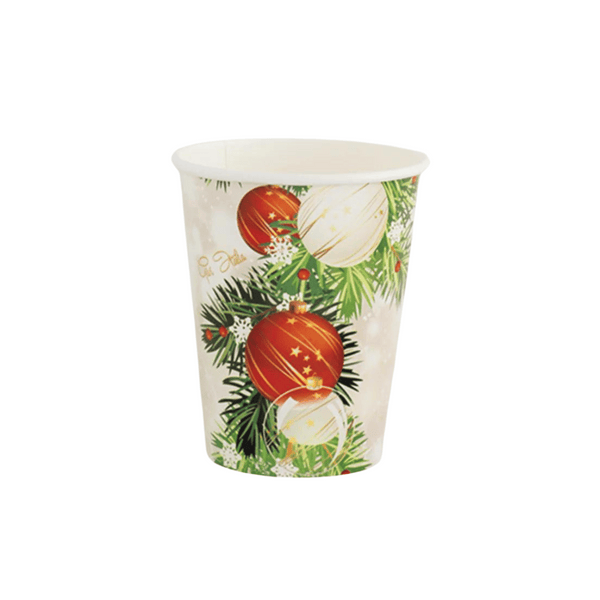 Bicchiere in carta stampa natalizia nella parte esterna, interno colore bianco. Capacità del bicchiere 250 cc