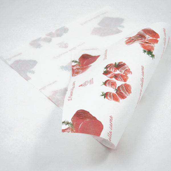 Carta per alimenti da 45 g/m², accoppiata, antigrasso e impermeabile, con stampa generica (come da foto). Ideale per incartare e proteggere salumi, formaggi e carne fresca. Perfetta per macellerie, salumifici e negozi di gastronomia.