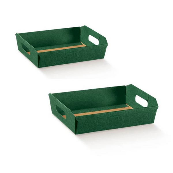 Cesti in cartone verde per confezioni di Natale e non solo. Cesto verde finitura tela in cartone ideale per confezioni regalo Natale. Contenitore in cartone con maniglie, per prodotti enogastronomici vari. Le misure indicano in ordine lunghezza, larghezza e altezza del cesto.
