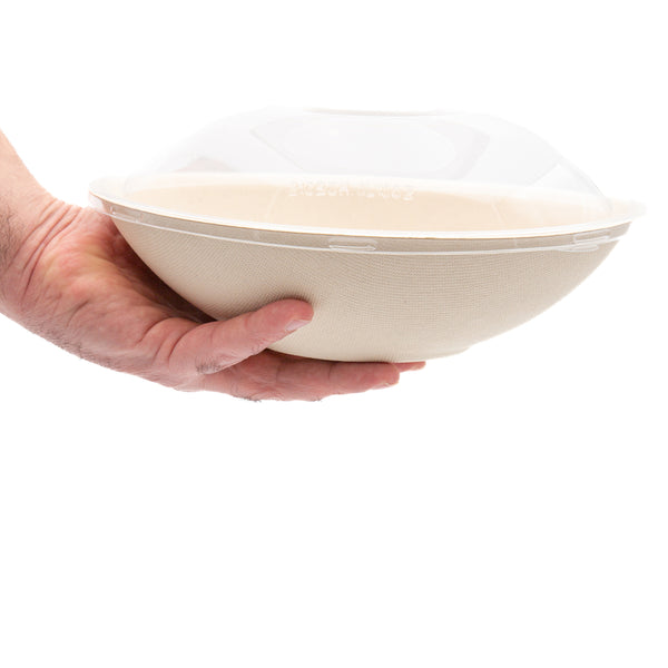 Contenitore biodegradabile per alimenti ovale in fibra di canna da zucchero. Ciotola eco colorazione avana la base e coperchio trasparente. Il coperchio è in pet trasparente e può essere tranquillamente smaltito nella plastica. La base della ciotola è bio in fibra di canna da zucchero. La base della ciotola è perfetta anche come insalatiera. Il coperchio è trasparente.