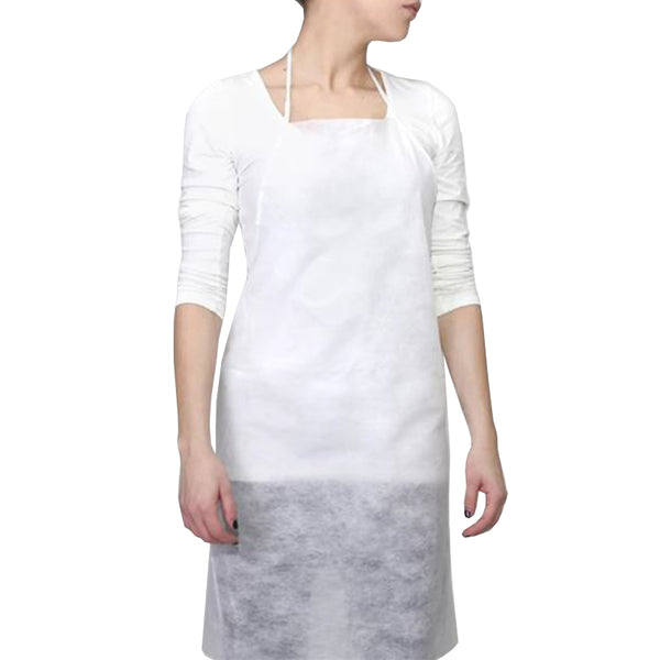 Grembiule usa e getta corto con pettorina e lacci in vita in TNT polipropilene. Colore bianco. Grammatura del tessuto: 50 gr/mq.