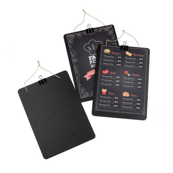 Lavagna per menù nera con corda per essere appensa. Su questa pagina alla variante 01 troverai anche il pennarello a gesso liquido colore bianco utile a scrivere messaggi nella tua lavagna. Questa lavagnetta è lavabile con acqua, perfetta per scrivere menù di ristoranti, bar, e negozi commerciali. La lavagna comprende oltre al cordino anche una molletta per appenderla. Insieme alla lavagna è inclusa anche una molletta per appendere un foglio A4.